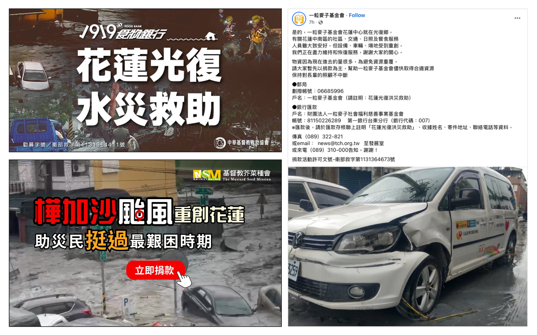 本次捐款對象包括但不限於:財團法人基督教芥菜種會、社團法人中華基督教救助協會、財團法人一粒麥子社會福利慈善事業基金會...等公開募款單位,相關募款資訊也可上相關單位官方平台與社群臉書查詢。