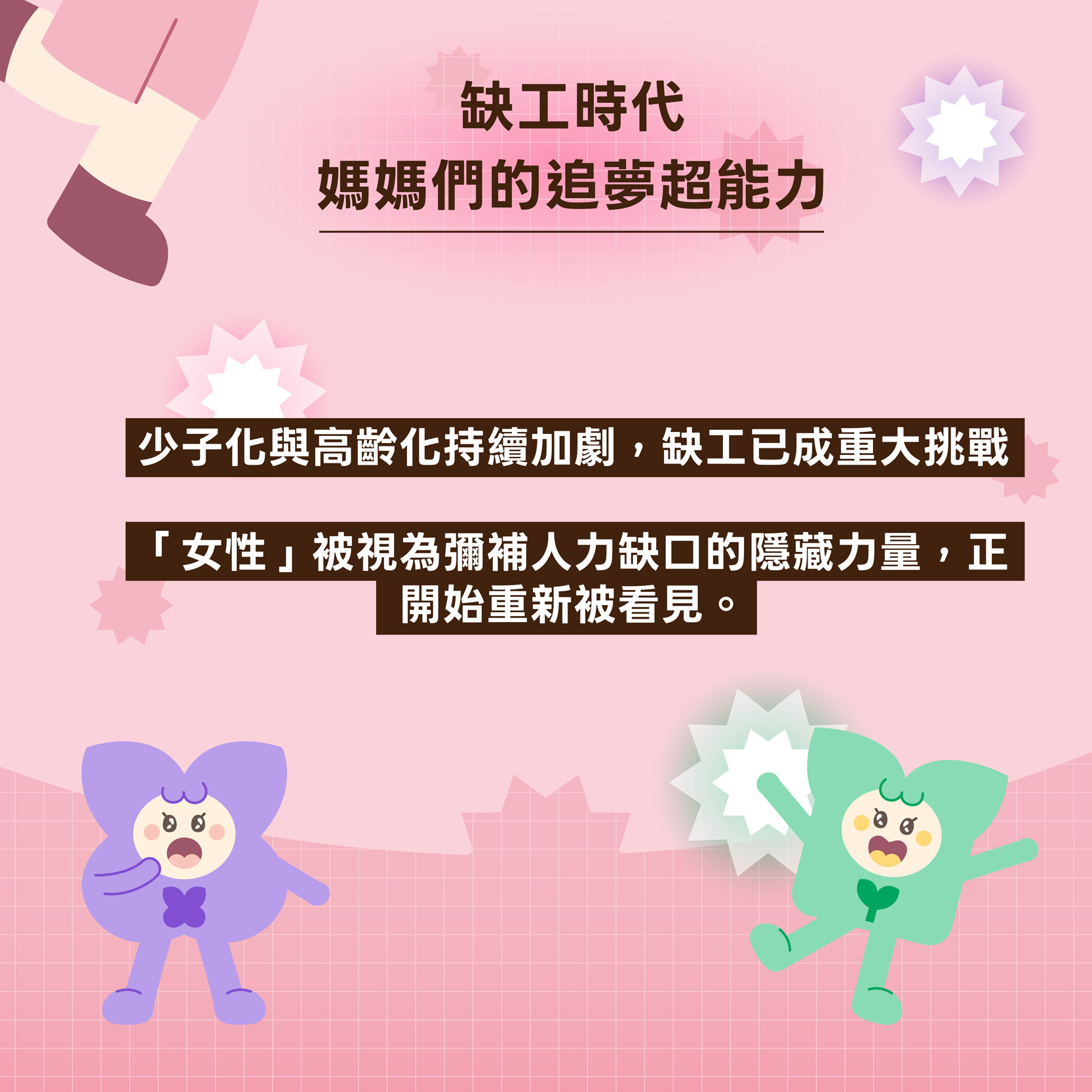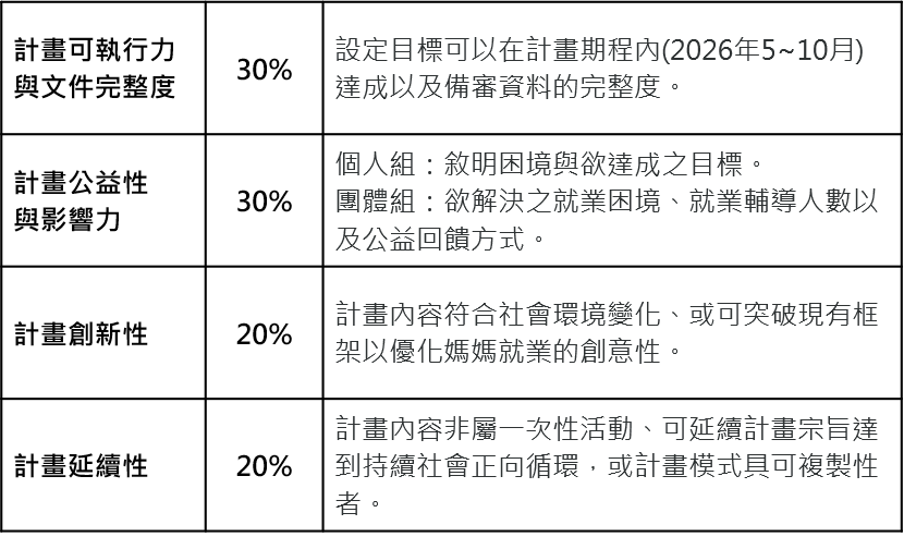 符合「鄰里社區經濟」或「創新多元就業」兩大主題,促進弱勢或不利處境媽媽重返職場或創業之提案。