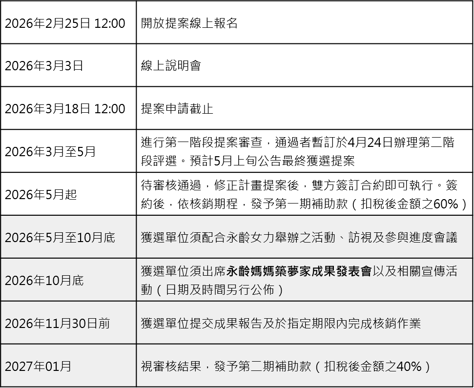 3. 獲補助案件須於2026年11月30日以前提交全案執行完畢之結案報告,並於主辦單位通知之指定日期內完成所有核銷作業(此為提案執行最遲應完成日期,如提案提早執行完成可提早結案)。