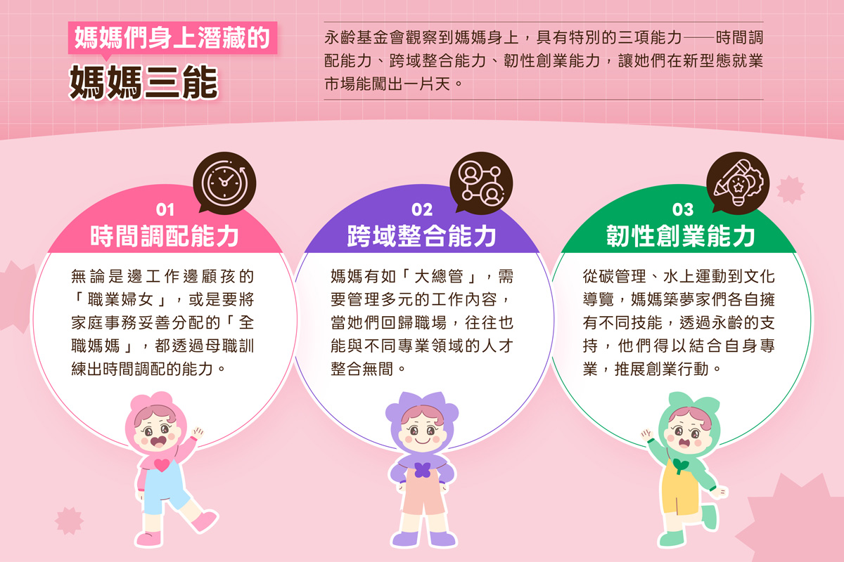 永齡基金會秉持「給魚、給釣竿、教釣魚」的信念,積極輔助弱勢者重新站起來,讓每位受助者變成自助者,甚至成為助人者,讓愛接力,成為善的循環。自2023年起,以人才永續、效益永續、經濟永續、社會永續的公益精神,推出「永齡女力」計畫,關注女性身心健康、培力增能、及重新定位三大面向,並持續推動女性二度就業相關計畫。2024年發起「永齡媽媽築夢家」多元就業徵件活動,徵集符合媽媽多重勞動特性、發展鄰里經濟或鼓勵友善職場的創意提案,結合不同社會資源,陪伴提案者在執行過程中共同成長,促進弱勢或不利處境媽媽們重返職場。